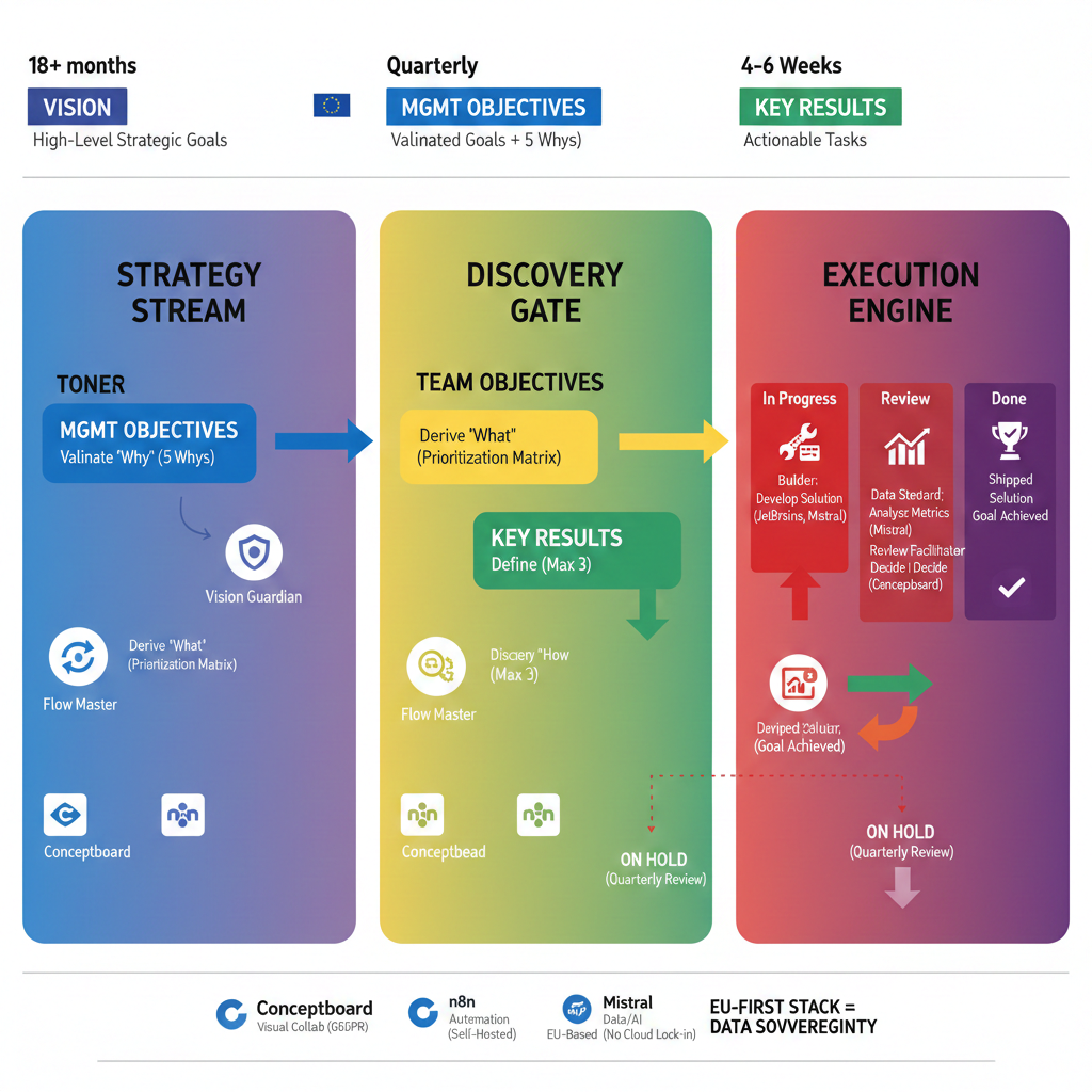 The Discovery Lead confirms which EU-First tool is required for each result (e.g., n8n for automation, JetBrains for code, Mistral for data).